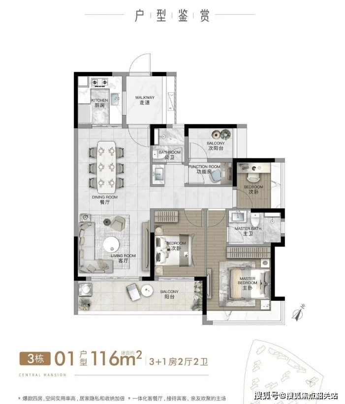 建面116㎡的四房两卫户型,社保年限要求由本来的5年缩短至3年。中高楼层视野采光更好,